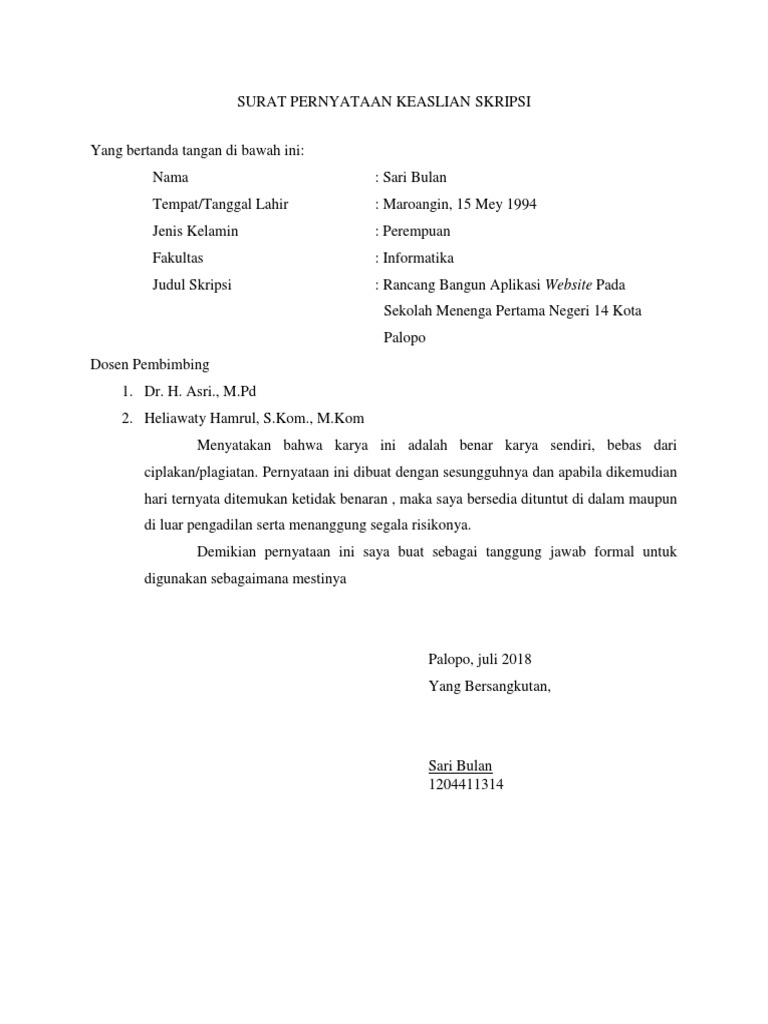 Setelah kesepakatan bersama, maka dibuatlah surat pernyataan persetujuan yang menjadi jaminan dan bukti autentik sebelum kesepakatan atau. Contoh surat pernyataan tanggung jawab mutlak. Contoh surat pernyataan keaslian skripsi. Contoh surat pernyataan resmi sangat penting untuk menunjukkan keseriusan dan kebenaran suatu fakta serta untuk tugas dan hal yang penting. Dengan ini saya menyatakan bahwa skripsi berjudul pengaruh pembelajaran kontekstual terhadap prestasi belajar biologi di sma negeri i ciamis ini beserta seluruh isinya.